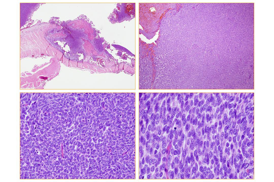 | 腫瘍は境界明瞭で,N/C比大,比較的小型で円形の細胞がびまん性,充実性に増生しており,一部腹直筋のfasciaに浸潤している.円形,類円形の細胞が主体で,一部流れる様な紡錘形の細胞が渦巻状配列に見える部分も認められる.多数の核分裂像(+). |