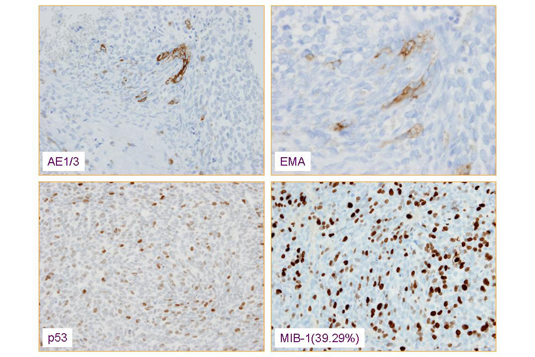 | 腫瘍の辺縁部でやや紡錘形を示す細胞にfocalではあるが,EMAとAE1/3陽性所見を認めた.MIB-1 labeling indexは39.29%. |